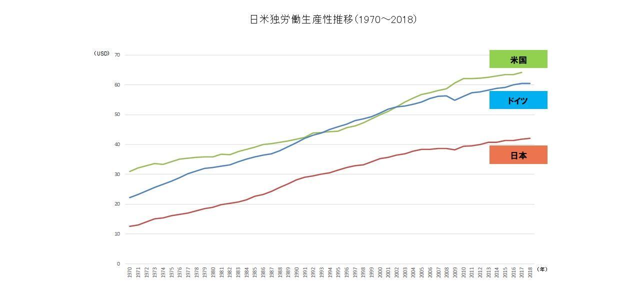 前回、日本生産性本部が設立された1955年から、多くの産業人材が欧米に派遣され、経営管理技術を学び、日本の生産性を飛躍的に高めたことに触れた。下図は1970年以降の日米独の生産性水準を表すグラフであるが、日本の生産性が飛躍的に高まったことがよくわかる。米独も同時期に生産性を高めており、その水準では日本とは常に一定の差が存在している。