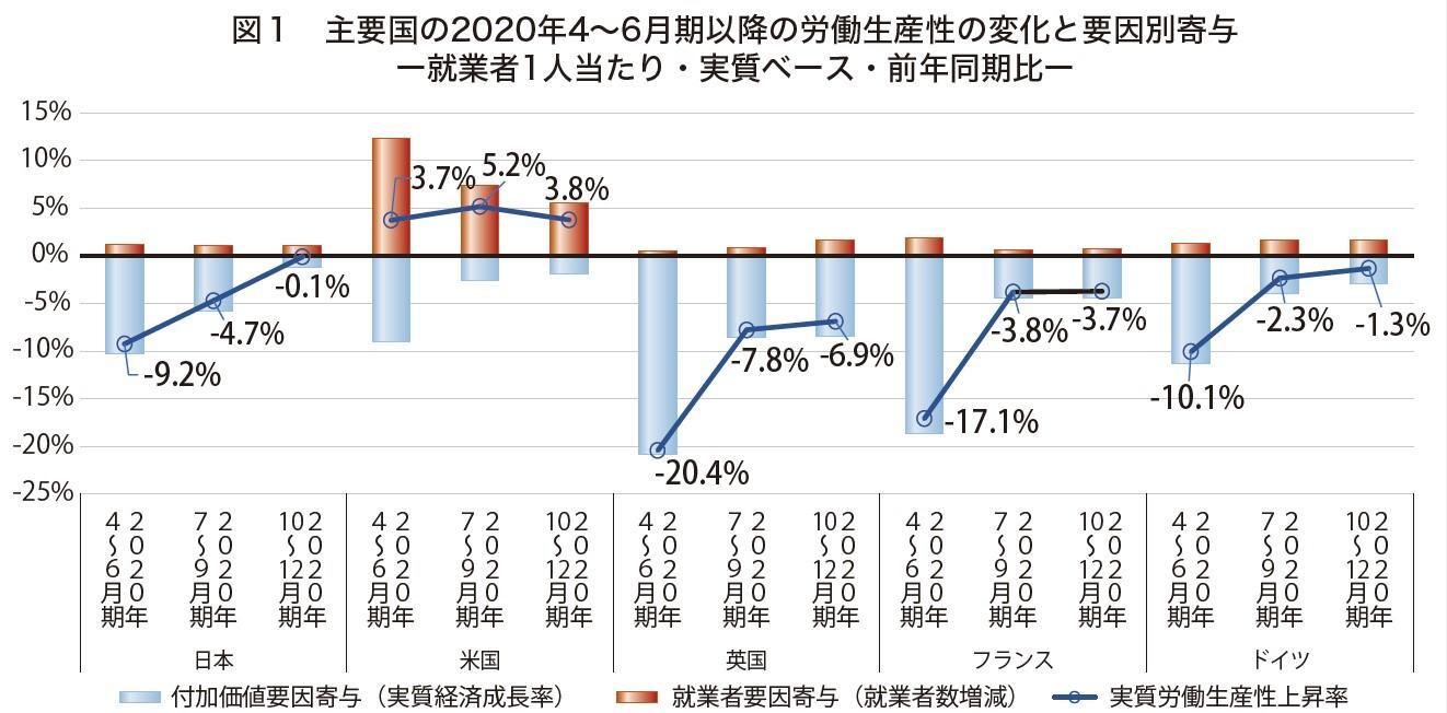 これまでの回でも触れてきたように、経済成長と発展の基盤は生産性にある。ただ、足もとをみると、コロナ禍に伴う経済的な混乱を受けて労働生産性が乱高下する国が多くなっている。実際、日本生産性本部がOECDデータベースをもとに計測した労働生産性は、2020年4~6月期に多くの国で1年前より大きく落ち込んだ。2020年10~12月期の労働生産性をみても、米国は1年前より4%近く高い水準で推移しており、日本もほぼ前年水準にまで回復してきているが、英仏では経済が停滞する中で、雇用維持を図ったため、依然として1年前の水準を4~7%下回る状況にある(図1参照)。