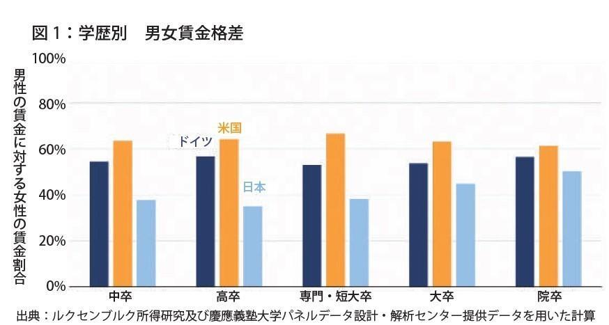 図1は、ブルッキングス研究所が各国家計調査などをベースとしたルクセンブルク所得研究(LSI)のデータ(2004-2018年)を用いて年収と学歴の関係を調べたものである。日米独3カ国とも男女間の賃金はかなりの格差があり、全ての学歴について平均的な女性の賃金は平均的な男性の賃金の7割以下となっている。日本は男女格差が3カ国中最も著しく、男性の賃金に対する女性の賃金割合は、中卒、高卒、短大・専門卒いずれも40%に届かず高卒は最も低い35%となっている。大卒ですら男性の半分に届かず、院卒でようやく50%程度であり、米国がいずれの学歴においても60%を超えているのとは対照的である。