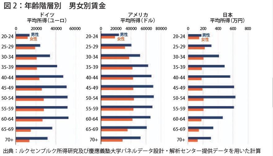 この背景には、図2のように男性の賃金が年齢と共に50代まで(ドイツでは60代まで)高くなる傾向があるのに対し、女性の賃金は比較的横ばいでピークも早いことが挙げられる。これらのデータからは、日本では女性が本来の生産性を発揮できるような仕事に就いておらず、経済活動全体から才能のある女性を締め出している可能性を示唆している。