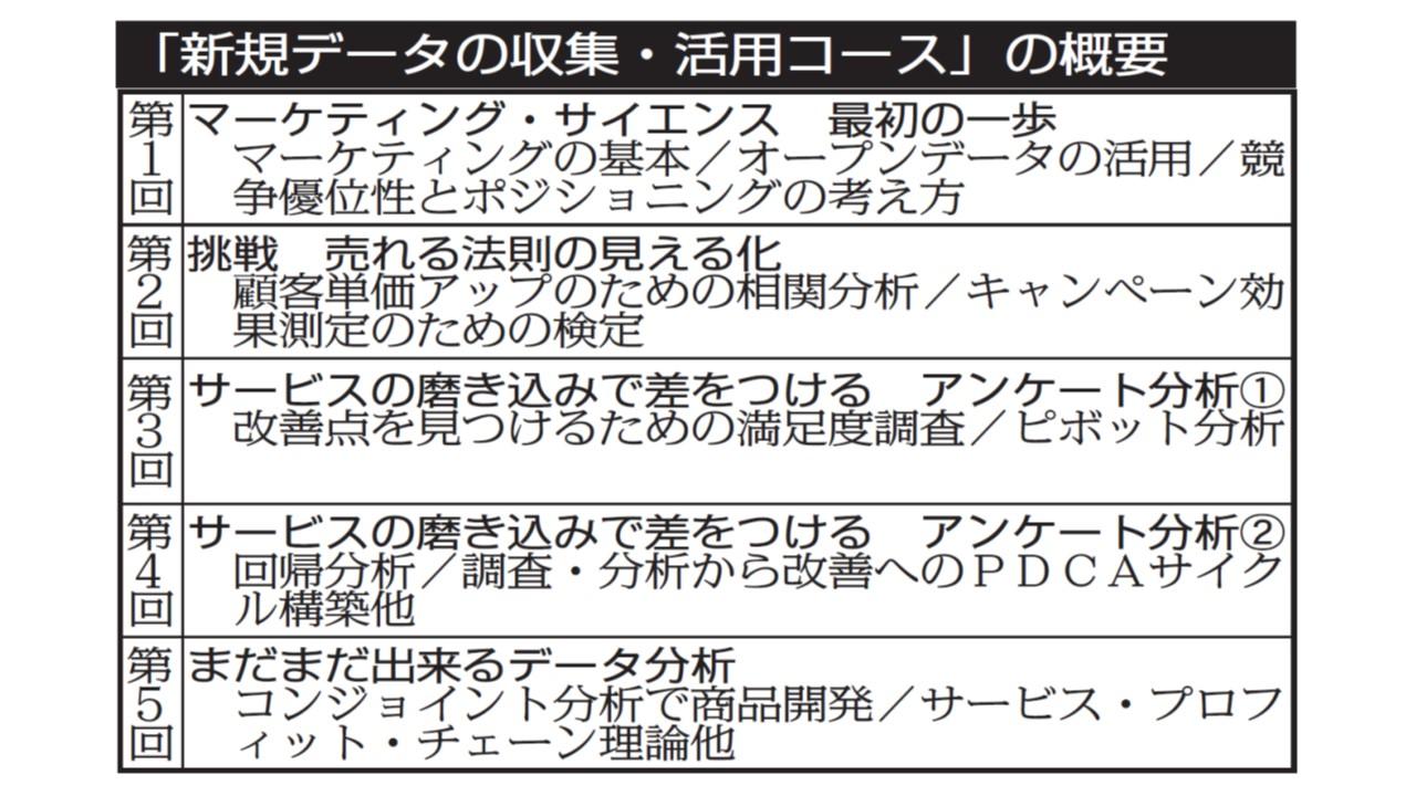 入門から応用実践レベルの「新規データの収集・活用コース」(マーケティング論、全5回)では、自社の課題に応じて、簡単な方法(アンケートや広告におけるログ、公開データ等)と、そのデータを用いた分析の演習を行う。データの活用で売上拡大や業務効率化などを目指しているが、データの収集・蓄積がまだ十分でない企業や、データを使うことでどのようなことができるかを学びたい企業を対象とした。
