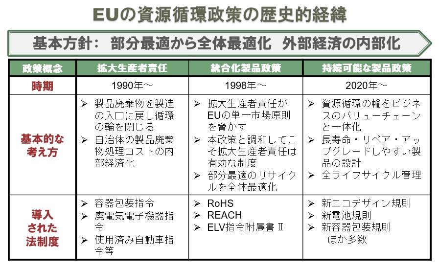 EUの資源循環政策の始まりは1990年初頭の「拡大生産者責任」に遡る。この概念は日本にも導入され、家電や自動車などの個別リサイクル法に適用されており、使用済み製品のリサイクルを行う責任をメーカーに課す制度である。その目的は、消費者の排出から製造の入口に戻す循環の輪を構築すること、また自治体が担っていた製品廃棄物に関わる外部経済を経済活動の一環として内部化することにあった。