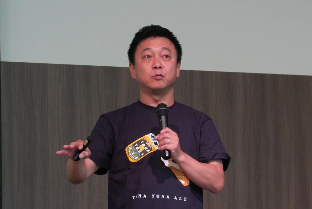 続いて、「ビールに味を!人生に幸せを!」をミッションに、ビールを中心としたエンターテイメント事業を行うヤッホーブルーイングの井手氏が「よなよなエール流市場創出」をテーマに、プロ野球・日本ハムファイターズとの協業の事例を発表した。