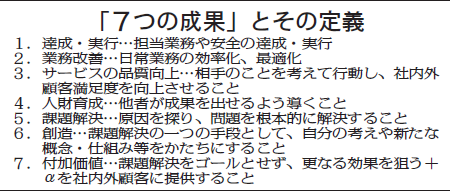 プロジェクトチームでは、「私たちは何を大事にしていくか」というところから議論をスタートさせた。我々が生き残るためには成果をきちんと出していくことが大事であり、その成果とは、経営理念を実現していくために、現状より少しでもより良い変化を起こしていくことだという議論を経て、経営理念を実現する成果としてまとめたのが「7つの成果」になった。