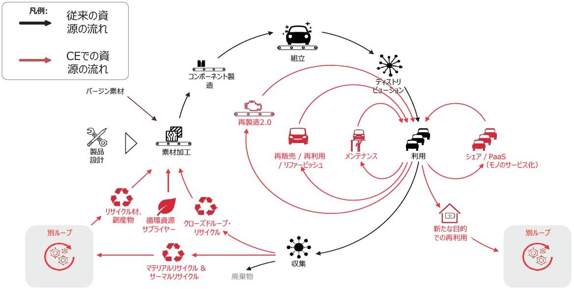日本版サーキュラーエコノミーの概念図は「循環経済ビジョン2020」では図のように示されている。日本では比較的早い時期より、適正廃棄物処理やゼロエミッションの観点からもリサイクルが促進されており、ものづくりの一部を構成する「なくてはならないインフラ」的存在となっている。サーキュラーエコノミーでは、ものづくりに再生材を供給するためのリサイクルという位置づけとなり、これまで以上にクローズドループリサイクルやマテリアルリサイクルが求められることとなる。しかし、リサイクルには収集や分離にエネルギーを要するので、大量にものづくりをして、大量にリサイクルをしていたのでは、カーボンニュートラルとの両立は困難である。そこで、サーキュラーエコノミーでは、ものづくりサプライチェーンのさらに内側に多重の資源循環ループを創り、省資源で機能を最大限に活用して、人類のウェルビーイングを向上させ、経済を活性化させる仕組みが重要となる。この内側の資源循環ループは、内側になればなるほど消費者の行動変容をも必要とし、現在とは異なるビジネスモデルが展開される必要があるものの、環境負荷と資源消費の両方の低減を達成するには効果的である。