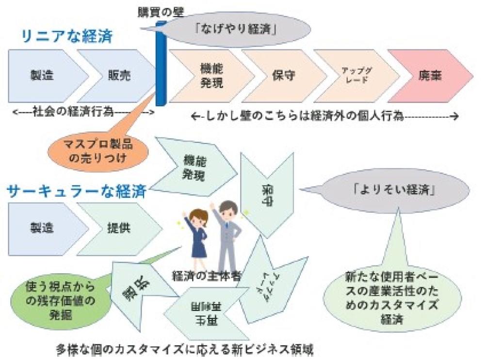 「持続可能社会のためにCEを行わねばならず、何をするか」という発想ではなく、新たな経済では、一方的な物売りではなく、使用者が価値を感じるところをビジネスにする「よりそい経済」だと考えてほしい。多様な人々、中には高齢化や過疎化などで問題の渦中にある使用者に対しても、現在あるモノから残存価値を発掘・活用し問題解決の一助とする、使用者に寄り添った発想からこそ道が見つかるであろう。