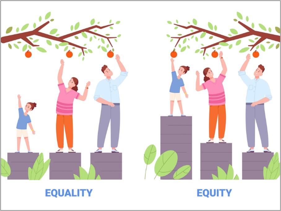 左側の3人には等しく、同じ高さの台が用意されています。全員に対してサポートがあるのですが、その方法では、リンゴに手が届かない人が出てきてしまいます。一方、右側の3人は、それぞれの人に合わせた高さの台が用意され、全員が、リンゴに手が届いています。