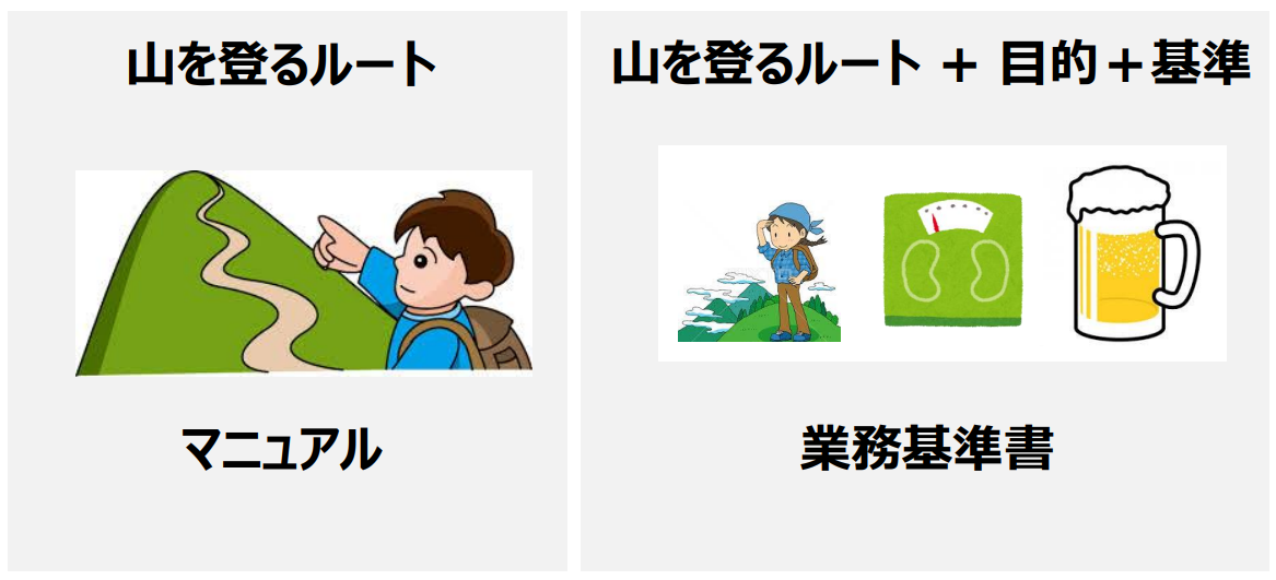 これまでの話を登山に例えてみます。一般的な業務マニュアルは、左図のとおり、山を登るルート(手順・方法)だけしか書いていないので、例えムダが多く非効率と感じても、従業員はこのルートのまま進んでしまいます。
