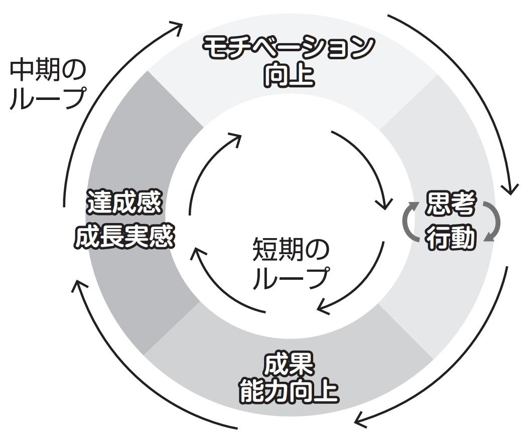 例えば中期のループがあることで本人にとって動機の軸を増やすことができる。短期のループで動機の源泉となるのは主に目先の具体的な目標を達成したいという意欲であるが、中期のループがあることでキャリアビジョンの実現といった少し先の抽象的な目標の達成という動機も持ち得る。